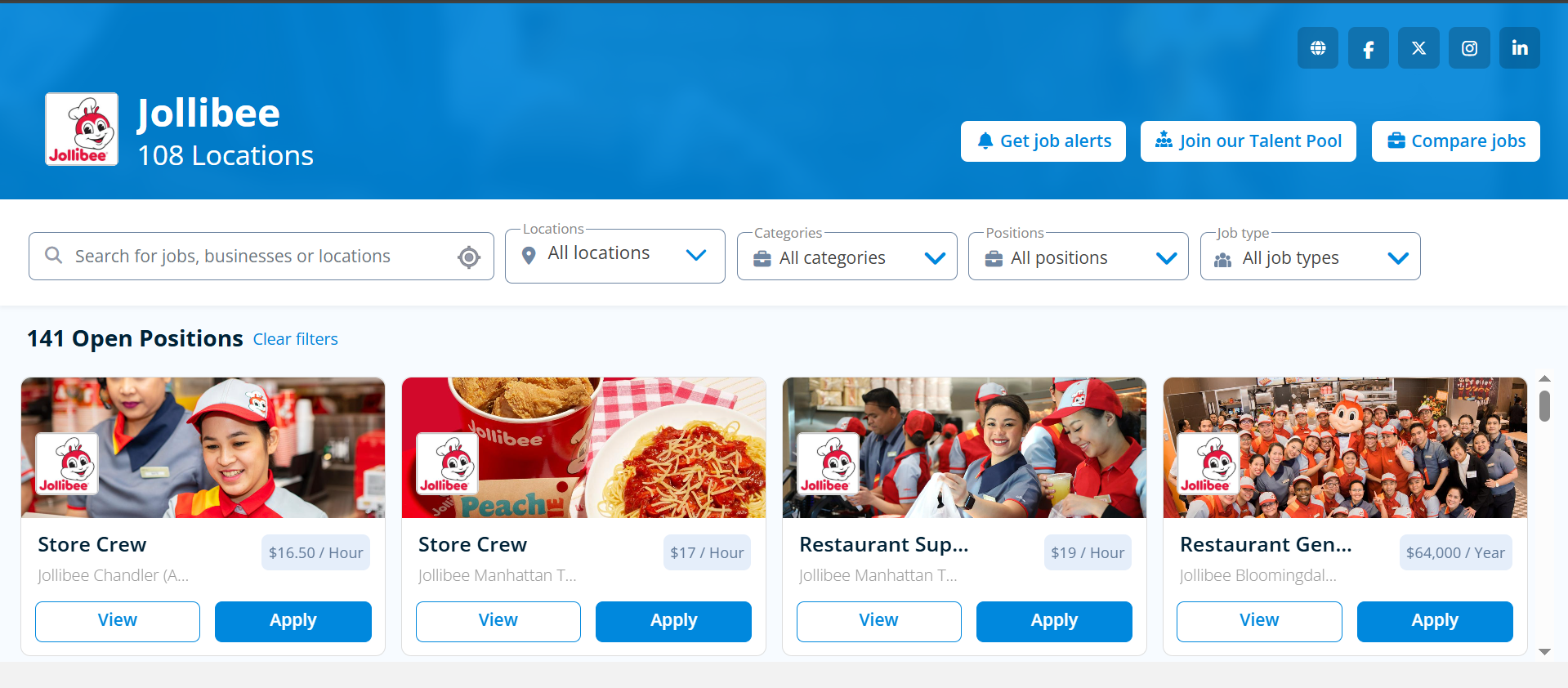 Search field positions on the Jollibee Careers page and filter by your preferred location.